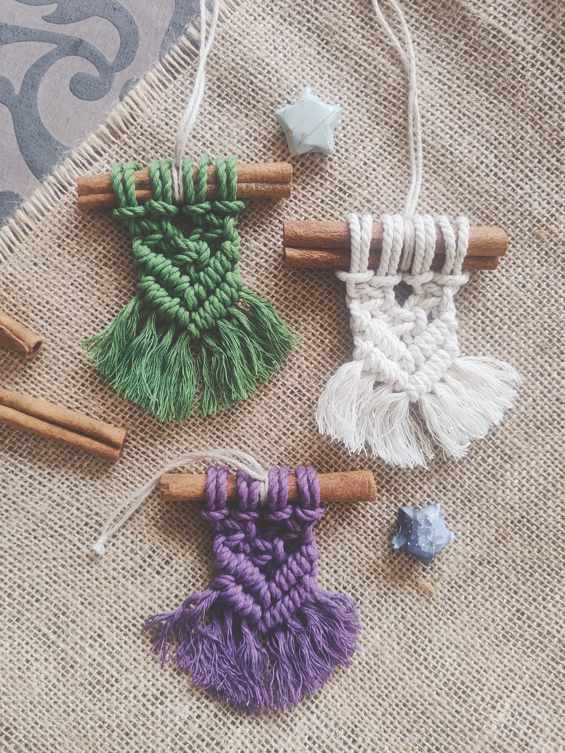 Une décoration de Noël bohème en corde coton, monté sur un bâton de cannelle